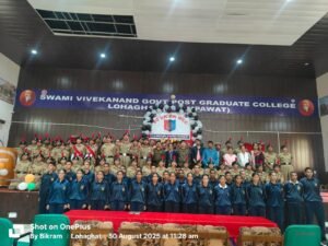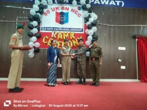 *महाविद्यालय में आयोजित हुआ रैंक समारोह* स्वामी विवेकानंद राजकीय स्नातकोत्तर महाविद्यालय लोहाघाट के एनसीसी यूनिट में रैंक समारोह का आयोजन किया गया व नए सत्र के लिए जिम्मेदारी प्रदान की गई। कार्यक्रम के मुख्य अतिथि 80 यूके बी एन के कमान अधिकारी लेफ्टिनेंट कर्नल श्री देवेश सिंह एरी रहे, उन्होंने कैडेट्स को एनसीसी के अनेक लाभों को बताया व कहा कि एनसीसी के माध्यम से सेना में अधिकारी बनने के तमाम अवसर हैं। प्राचार्य प्रोफेसर संगीता गुप्ता ने सभी अतिथियों का स्वागत करते हुए कैडेट्स की उज्ज्वल भविष्य की कामना की। लेफ्टिनेंट डॉक्टर कमलेश शक्टा ने कार्यक्रम की रूपरेखा रखी और बटालियन के निरंतर मिल रहे सहयोग का आभार प्रकट किया। कार्यक्रम के दौरान कैडेट्स ने भावपूर्ण सांस्कृतिक प्रस्तुतियां दी। नए सत्र हेतु कैडेट सीनियर अंडर आफिसर दीपांशु जोशी, अंडर आफिसर योगिता प्रथोली, अंडर आफिसर अंकित फर्त्याल, कंपनी क्वार्टर मास्टर हिमांशु चंद, सार्जेंट नितिन चौबे, कॉरपोरल प्रियांशु ढेक, कॉरपोरल भावना, लांस कॉरपोरल सपना, लांस कॉरपोरल हिमांशु जोशी चुने गए। इस अवसर पर बटालियन के बीएचएम बिक्रम सिंह सहित 103 कैडेट्स उपस्थित रहे।