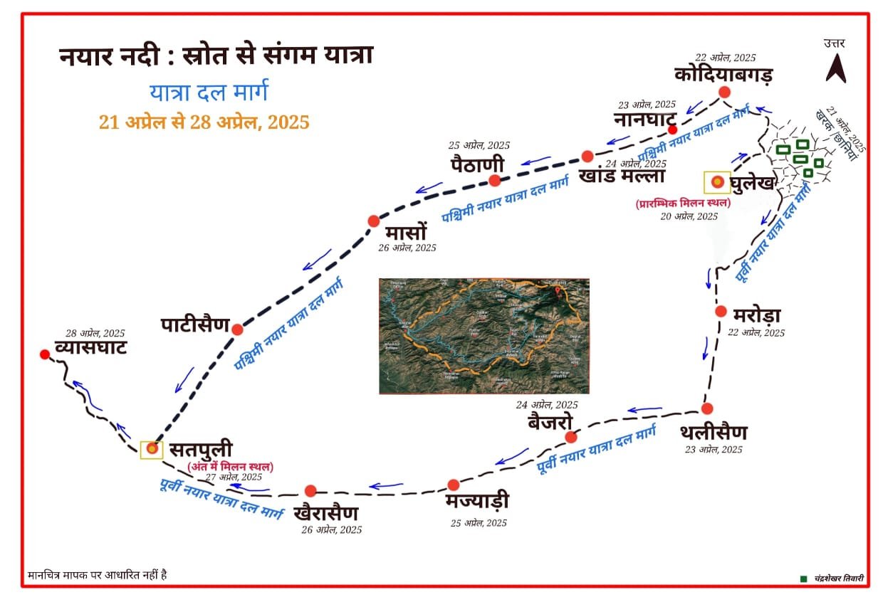 अस्कोट-आराकोट यात्रा अभियान-2024 में इसके समानांतर स्त्रोत से संगम यात्राएं भी आयोजित हुईं। इसी क्रम में नयार नदी: स्त्रोत से संगम अध्ययन यात्रा घुलेत गांव से 21 अप्रेल, 2025 से आरम्भ होकर एक सप्ताह बाद 28 अप्रेल, 2025 को सतपुली होकर व्यास घाट में समाप्त होगी। तकरीबन 100 किमी. की इस यात्रा में युवा छात्र, शोधार्थी, वैज्ञानिक, भूगर्भशास्त्री, समाज विज्ञानी और सामाजिक कार्यकर्ता प्रतिभाग कर रहे हैं। मुख्य रुप से नयार नदी के उद्गम स्थल दूधातोली पर्वत श्रंृखला से गंगा नदी के संगम व्यासघाट तक इसके बहुआयामी बदलावों पर स्थानीय जन समाज से विचार-विमर्श किया जायेगा। स्थानीय भूगोल,समाज,इतिहासश् आर्थिकी, जल-जंगल-जमीन के साथ ही यहां के पारिस्थितिकी तंत्र का अवलोकन कर महत्वपूर्ण मुद्दों को जानने-समझने की कोशिश इस यात्रा में की जायेगी। गांव समाज से प्राप्त अनुभवों के आंकड़ों-विवरण के आधार पर एक व्यापक रपट तैयार करने का प्रयास रहेगा। बाद में इस रपट को जन हित में सार्वजनिक किया जायेगा।